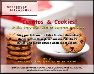 Bring your kids over to our favorite bookshop for English storytelling, cookies and book browsing on Sunday at 4pm! Desperate Literature is hosting the first of an exciting new weekly tradition called 'Cuentos y Cookies'. We also happen to know the story-teller herself, Emma, so we can assure you that you and your children will be in very good hands! So get your shoelaces tied up, kids - they've got a story for you!